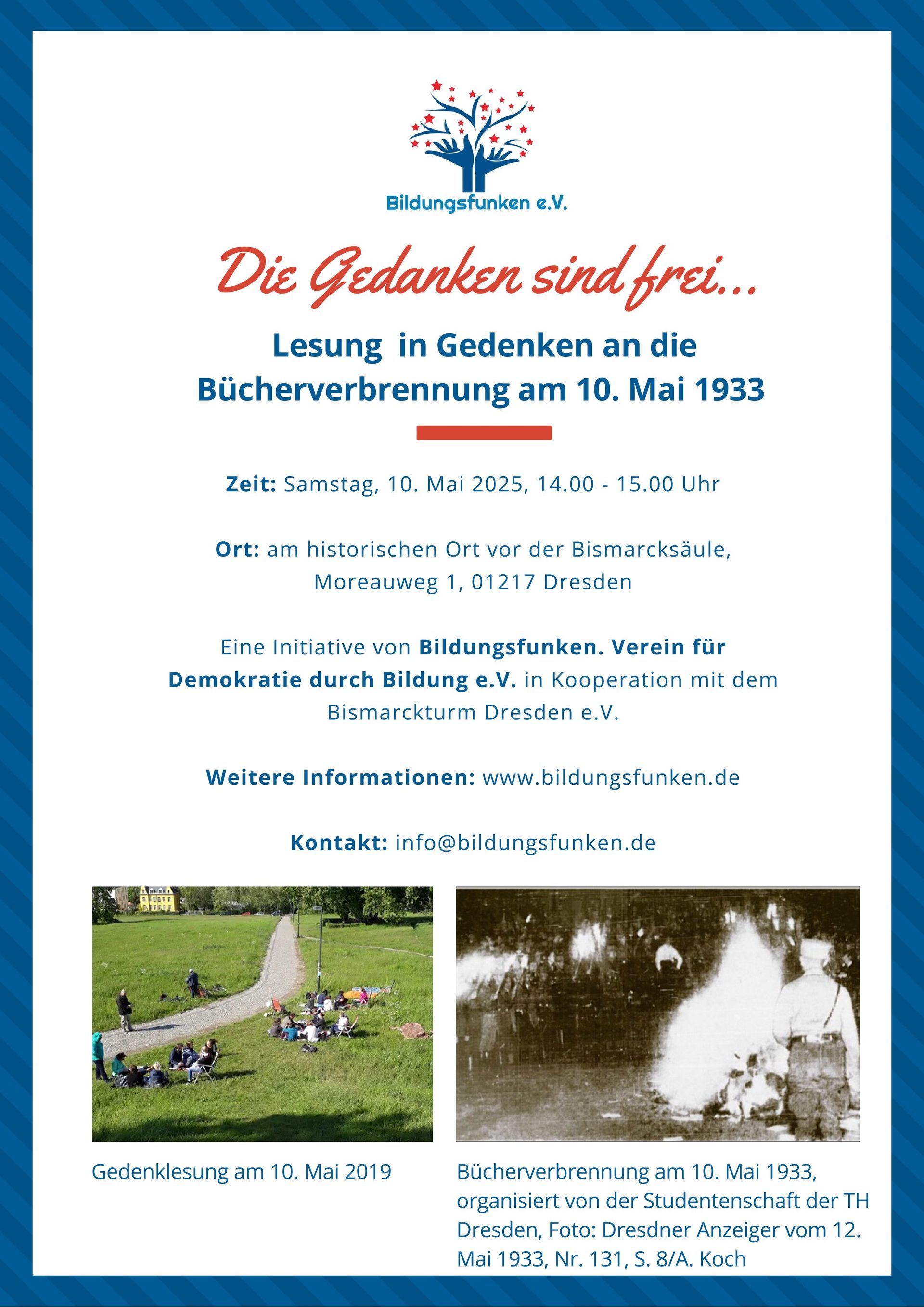 Die Gedanken sind frei: Gedenk-Lesung zur Erinnerung an die Bücherverbrennung 1933 am historischen Ort der Räcknitzhöhe (Bismarcksäule, Moreauweg 1, siehe Plakat oben)